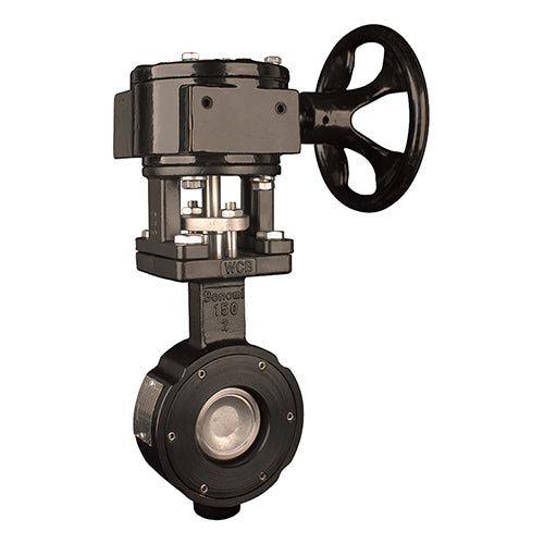 Gear Operator; Carbon steel ANSI 150 Wafer style, sizes 2" to 12"; ISO 5211 direct mounting pad/square stem; Compact design, easy access to packing; Replaceable seat design; Multiple V-ring stem packing; Reliable and consistent torque; R.P.T.F.E. seats, metal seats upon request; 150 WSP; Temperature range -20°F to 475°F